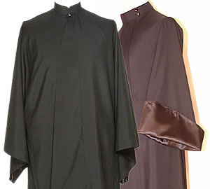 | The Riassa is the outer garment with wide sleeves and long, lower cuffs. Riassas also have two basic styles. The first exactly corresponds to the first style of cassocks - Russian style (see cassocks), and distinguishes itself only with the style of the sleeves - long and broadening downwards. The second form of the riassa is straight-lined, widening from the base to the ends. This style of the riassa is known as the Greek style. Riassas are primarily black, but can be dark-blue, brown, white, cream-colored, and gray. Materials used for riassas are basically the same used for cassocks. Cassocks and riassas can also be lined. Riassas also exist for every day, acting as a fall or winter coats. These riassas of first (Russian) style, with its turn-down collar can be trimmed with black velvet or fur (see picture above). Winter riassa-coat can be made with a warm lining.Allow 8-12 weeks for delivery from the order date. |